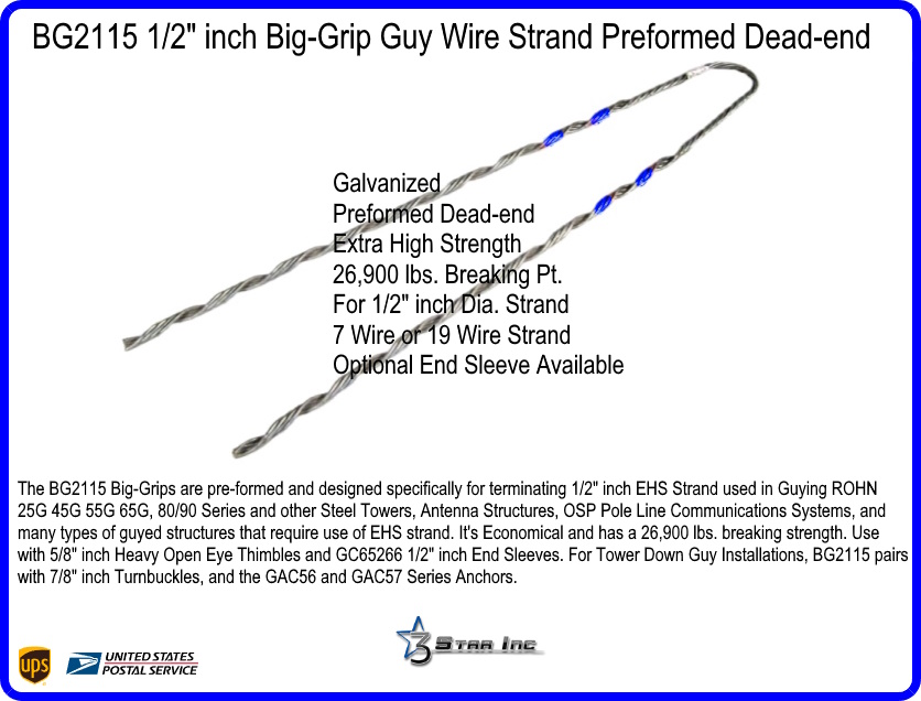 The BG2115 Big-Grips are pre-formed and designed specifically for terminating 1/2" inch EHS Strand used in Guying ROHN 25G 45G 55G 65G, 80/90 Series and other Steel Towers, Antenna Structures, OSP Pole Line Communications Systems, and many types of guyed structures that require use of EHS strand. It's Economical and has a 26,900 lbs. breaking strength. Use with 5/8" inch Heavy Open Eye Thimbles and GC65266 1/2" inch End Sleeves. For Tower Down Guy Installations, BG2115 pairs with 7/8" inch Turnbuckles, and the GAC56 and GAC57 Series Anchors.