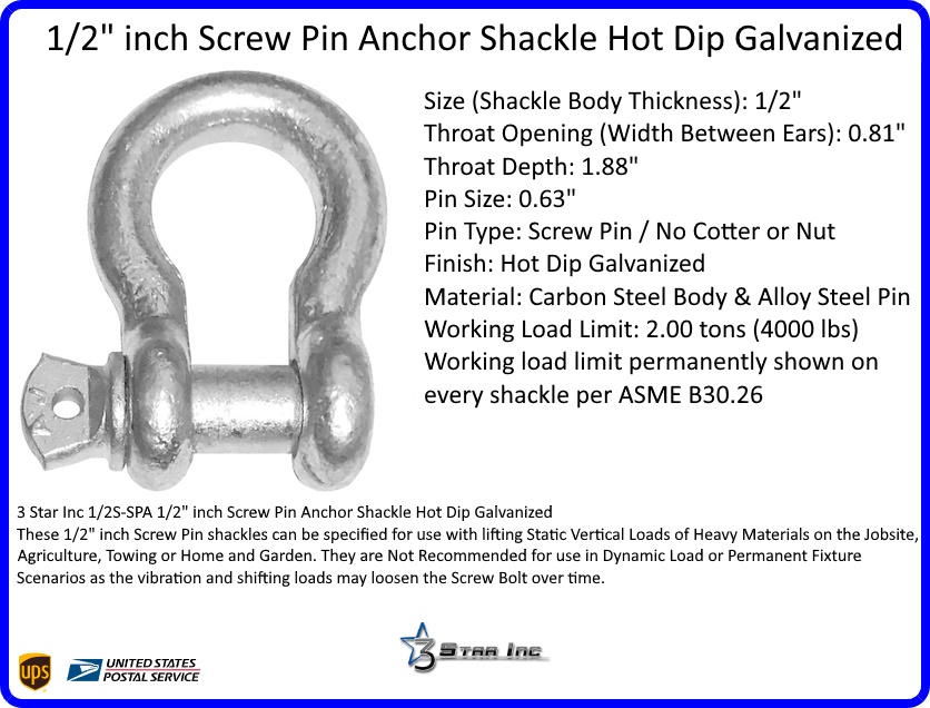 These 1/2" inch Screw Pin shackles can be specified for use with lifting Static Vertical Loads of Heavy Materials on the Jobsite, Agriculture, Towing or Home and Garden. They are Not Recommended for use in Dynamic Load or Permanent Fixture Scenarios as the vibration and shifting loads may loosen the Screw Bolt over time.