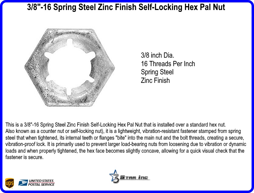 This is a 3/8"-16 Spring Steel Zinc Finish Self-Locking Hex Pal Nut that is installed over a standard hex nut. Also known as a counter nut or self-locking nut), it is a lightweight, vibration-resistant fastener stamped from spring steel that when tightened, its internal teeth or flanges "bite" into the main nut and the bolt threads, creating a secure, vibration-proof lock. It is primarily used to prevent larger load-bearing nuts from loosening due to vibration or dynamic loads and when properly tightened, the hex face becomes slightly concave, allowing for a quick visual check that the fastener is secure.