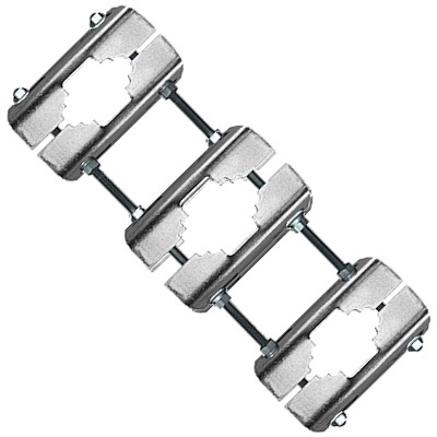 A Three-Way Pipe-to-Pipe Clamp Set (Pipe Size: 3-1/2" – 8-5/8") is a heavy-duty mounting clamp set used to Connect one center pipe to two side pipes (3 pipes total). Keeps pipes parallel and securely spaced , Uses threaded rods and heavy-duty clamps to tighten around the pipes , hot-dip galvanized steel for outdoor corrosion protection  , usually used in Telecommunications Towers , Cel tower sector frames , industrial pipe support systems or structural pipe frameworks