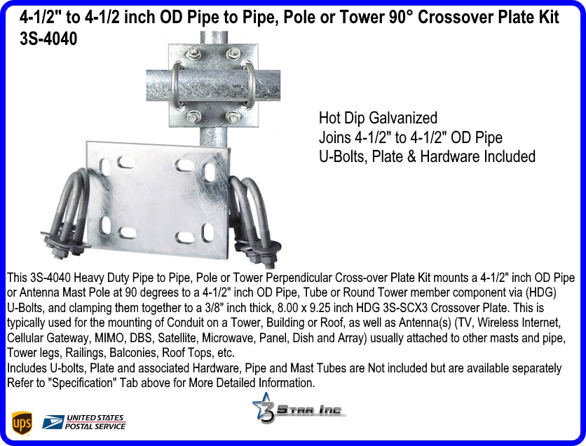This 3S-4040 Heavy Duty Pipe to Pipe, Pole or Tower Perpendicular Cross-over Plate Kit mounts a 4-1/2" inch OD Pipe or Antenna Mast Pole at 90 degrees to a 4-1/2" inch OD Pipe, Tube or Round Tower member component via Hot Dip Galvanized (HDG) U-Bolts, and clamping them together to a 3/8" inch thick, 8.00 x 9.25 inch HDG 3S-SCX3 Crossover Plate. This is typically used for the mounting of Conduit on a Tower, Building or Roof, as well as Antenna(s) (TV, Wireless Internet, Cellular Gateway, MIMO, DBS, Satellite, Microwave, Panel, Dish and Array) usually attached to other masts and pipe, Tower legs, Railings, Balconies, Roof Tops, etc.