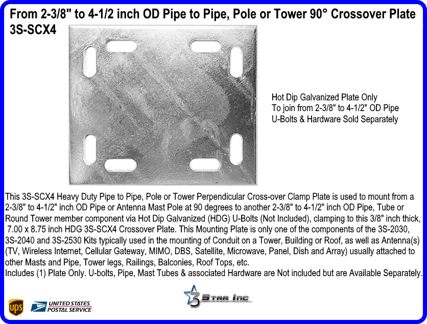 This 3S-SCX4 Heavy Duty Pipe to Pipe, Pole or Tower Perpendicular Cross-over Clamp Plate is used to mount from a 2-3/8" to 4-1/2" inch OD Pipe or Antenna Mast Pole at 90 degrees to another 2-3/8" to 4-1/2" inch OD Pipe, Tube or Round Tower member component via Hot Dip Galvanized (HDG) U-Bolts (Not Included), clamping to this 3/8" inch thick, 7.00 x 8.75 inch HDG 3S-SCX4 Crossover Plate. This Mounting Plate is only one of the components of the 3S-2030, 3S-2040 and 3S-2530 Kits typically used in the mounting of Conduit on a Tower, Building or Roof, as well as Antenna(s) (TV, Wireless Internet, Cellular Gateway, MIMO, DBS, Satellite, Microwave, Panel, Dish and Array) usually attached to other Masts and Pipe, Tower legs, Railings, Balconies, Roof Tops, etc.