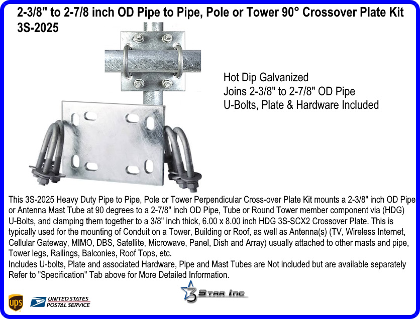This 3S-2025 Heavy Duty Pipe to Pipe, Pole or Tower Perpendicular Cross-over Plate Kit mounts a 2-3/8" inch OD Pipe or Antenna Mast Tube at 90 degrees to a 2-7/8" inch OD Pipe, Tube or Round Tower member component via Hot Dip Galvanized (HDG) U-Bolts, and clamping them together to a 3/8" inch thick, 6.00 x 8.00 inch HDG 3S-SCX2 Crossover Plate. This is typically used for the mounting of Conduit on a Tower, Building or Roof, as well as Antenna(s) (TV, Wireless Internet, Cellular Gateway, MIMO, DBS, Satellite, Microwave, Panel, Dish and Array) usually attached to other masts and pipe, Tower legs, Railings, Balconies, Roof Tops, etc.