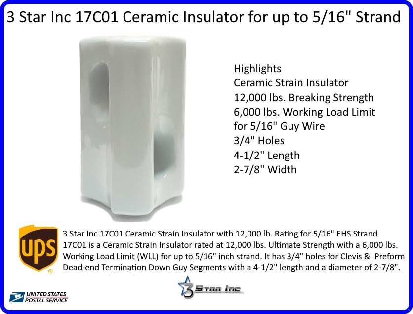 The 17C01 is a Ceramic Strain Insulator rated at 12,000 lbs. Ultimate Strength with a 6,000 lbs. Working Load Limit (WLL) for up to 5/16" inch strand. It has 3/4" holes for Clevis and Preformed Dead-end Termination Down Guy Segments with a 4-1/2" length and a diameter of 2-7/8". Guy Line Insulators are used to isolate RF (Radio Frequency) Electrical Conductivity and Passive Re-Transmission or Intermodulation by dividing guy wires into non-resonant sections. This prevents the guy lines from altering an Antenna's Radiation Pattern due to near-field interaction and for Ghosting Resonate Towers to Prevent Shadow Zones of other Transmitter Facilities Broadcast Coverage Area. A compression-type design is used and the insulator is compressed within the wire loops, so that if the insulator should break, the guy wires are still attached.