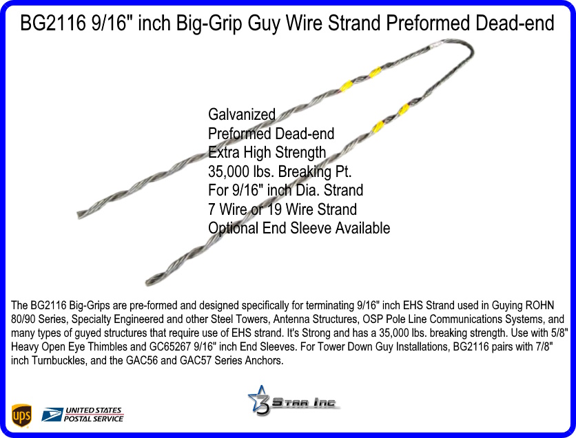 The BG2116 Big-Grips are pre-formed and designed specifically for terminating 9/16" inch EHS Strand used in Guying ROHN 80/90 Series, Specialty Engineered and other Steel Towers, Antenna Structures, OSP Pole Line Communications Systems, and many types of guyed structures that require use of EHS strand. It's Strong and has a 35,000 lbs. breaking strength. Use with 5/8" Heavy Open Eye Thimbles and GC65267 9/16" inch End Sleeves. For Tower Down Guy Installations, BG2116 pairs with 7/8" inch Turnbuckles, and the GAC56 and GAC57 Series Anchors.