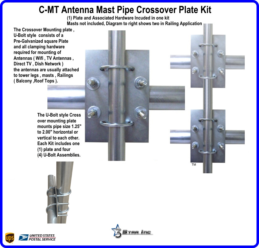 The Crossover Mounting plate, U-Bolt style consists of Pre-Galvanized square Plate and all clamping hardware required for mounting of Antennas (Wifi, TV Antennas, Direct TV, Dish Network) the antennas are usually attached to Tower legs, Masts, Railings (Balcony ,Roof Tops). The U-Bolt style Crossover mounting plate mounts pipe size 1.00" to 2.00". Sometimes used to affix a Twin antenna U-Mast Assembly to a vertical mast, but mostly used to affix a vertical mast to and existing horizontal appurtenance. Each Kit includes one (1) plate and four (4) U-Bolt Assemblies