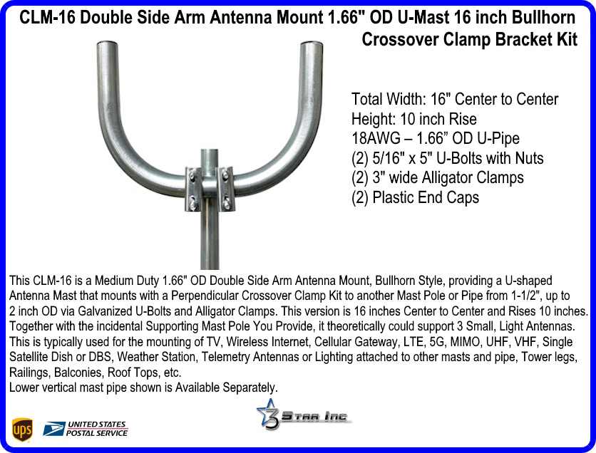 This CLM-16 is a Medium Duty 1.66" OD Double Side Arm Antenna Mount, Bullhorn Style, providing a U-shaped Antenna Mast that mounts with a Perpendicular Crossover Clamp Kit to another Mast Pole or Pipe from 1-1/2", up to 2 inch OD via Galvanized U-Bolts and Alligator Clamps. This version is 16 inches Center to Center and Rises 10 inches. Together with the incidental Supporting Mast Pole You Provide, it theoretically could support 3 Small, Light Antennas. This is typically used for the mounting of TV, Wireless Internet, Cellular Gateway, LTE, 5G, MIMO, UHF, VHF, Single Satellite Dish or DBS, Weather Station, Telemetry Antennas or Lighting attached to other masts and pipe, Tower legs, Railings, Balconies, Roof Tops, etc.