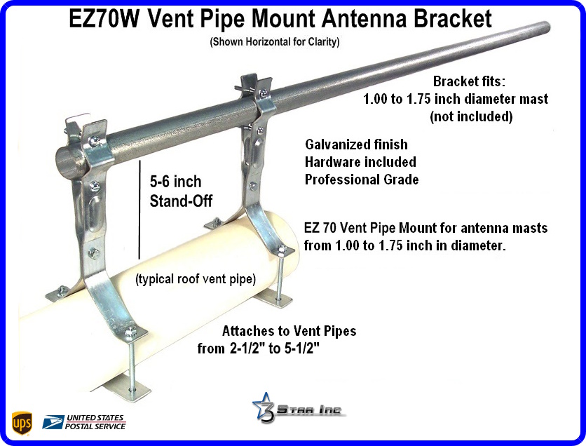The EZ 70W Roof Vent Pipe Antenna Mast Mounting Bracket is for Mounting Satellite Dish and Off Air TV Antenna to Larger Vent Pipes from 2.5" to 5.5" inches in Outside Diameter. Mast Mount with Hardware (Mast Not Included).
