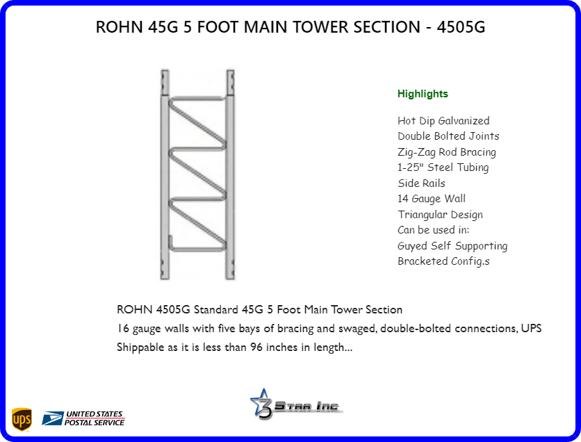 This ROHN 4505G is a 5 foot 45G Short Main Tower Section that can be used in ALL 45G Tower Series configurations. It is based upon the same 16-3/4" inch equilateral triangular design, constructed of extra heavy duty 1-1/4 inch steel 14 gauge wall side rails with continuous solid steel rod bracing and swaged, double-bolted connection joints just like the 45G 10' foot Main Tower Section but comes in at less than 96 inches in length.
