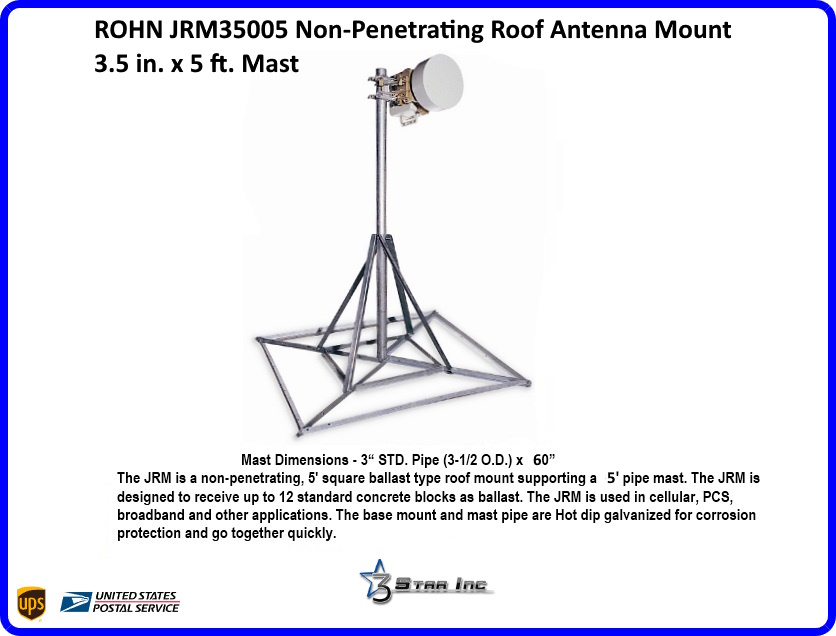 The JRM is a non-penetrating, 5' square ballast type roof mount supporting a 5’ pipe mast. The JRM is designed to receive up to 12 standard concrete blocks as ballast. The JRM is used in cellular, PCS, broadband and other applications. The base mount and mast pipe are Hot dip galvanized for corrosion protection and go together quickly.