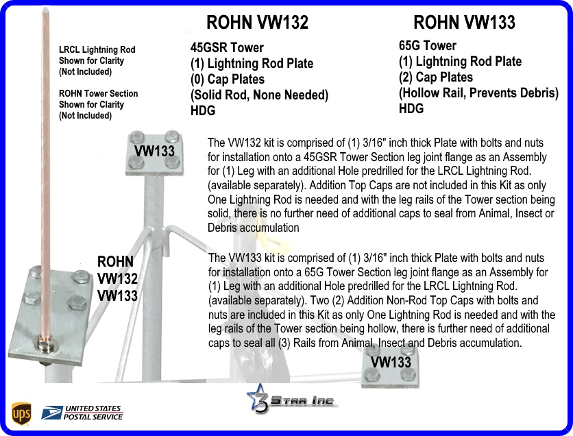 The VW132 kit is comprised of (1) 3/16" inch thick Plate with bolts and nuts for installation onto a 45GSR Tower Section leg joint flange as an Assembly for (1) Leg with an additional Hole predrilled for the LRCL Lightning Rod.(available separately). Addition Top Caps are not included in this Kit as only One Lightning Rod is needed and with the leg rails of the Tower section being solid, there is no further need of additional caps to seal from Animal, Insect or Debris accumulation.