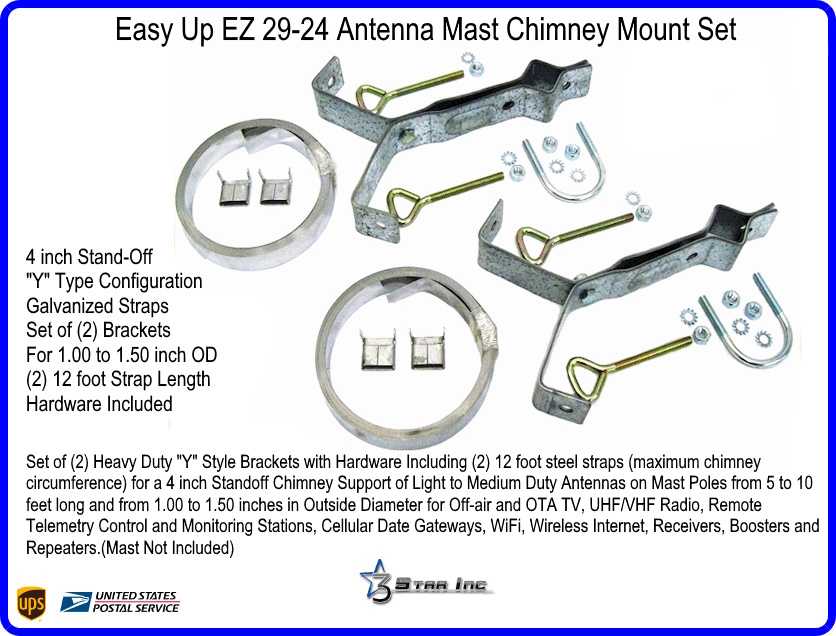 The Easy Up EZ 29-24 Antenna Mast Chimney Mount Set of (2) Heavy Duty "Y" Style Brackets with Hardware Including (2) 12 foot steel straps (maximum chimney circumference) for a 4 inch Standoff Chimney Support of Light to Medium Duty Antennas on Mast Poles from 5 to 10 feet long and from 1.00 to 1.50 inches in Outside Diameter for Off-air and OTA TV, UHF/VHF Radio, Remote Telemetry Control and Monitoring Stations, Cellular Date Gateways, WiFi, Wireless Internet, Receivers, Boosters and Repeaters.(Mast Not Included)