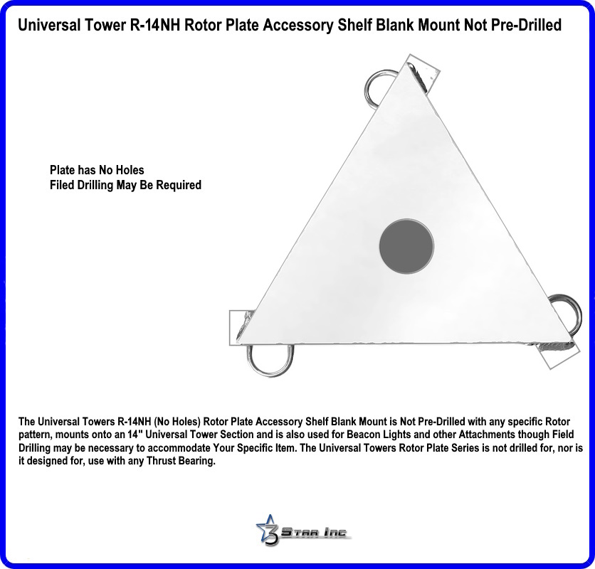 The Universal Towers R-14NH (No Holes) Rotor Plate Accessory Shelf Blank Mount is Not Pre-Drilled with any specific Rotor pattern, mounts onto an 14" Universal Tower Section and is also used for Beacon Lights and other Attachments though Field Drilling may be necessary to accommodate Your Specific Item. The Universal Towers Rotor Plate Series is not drilled for, nor is it designed for, use with any Thrust Bearing.