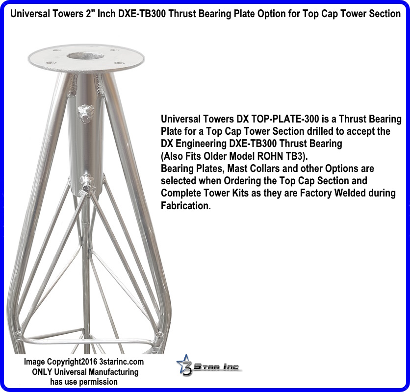 This Universal Towers DX TOP-PLATE-300 is a Thrust Bearing Plate OPTION AT TIME OF ORDER ONLY for a NEW Top Cap Tower Section drilled to accept the DX Engineering DXE-TB300 Thrust Bearing (Also Fits Older Model ROHN TB3).