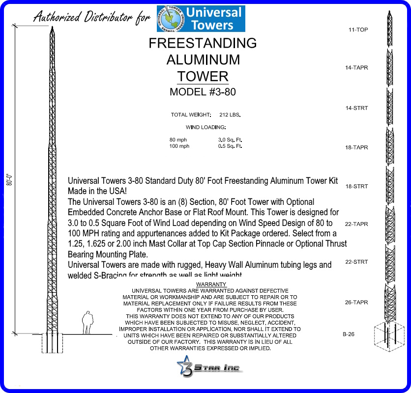 The Universal Towers 3-80 is an (8) Section, 80' Foot Tower with Optional Embedded Concrete Anchor Base or Flat Roof Mount. This Tower is designed for 3.0 to 0.5 Square Foot of Wind Load depending on Wind Speed Design of 80 to 100 MPH rating and appurtenances added to Kit Package ordered. Select from a 1.25, 1.625 or 2.00 inch Mast Collar at Top Cap Section Pinnacle or Optional Thrust Bearing Mounting Plate.