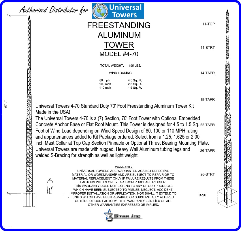 The Universal Towers 4-70 is a (7) Section, 70' Foot Tower with Optional Embedded Concrete Anchor Base or Flat Roof Mount. This Tower is designed for 4.5 to 1.5 Square Foot of Wind Load depending on Wind Speed Design of 80, 100 or 110 MPH rating and appurtenances added to Kit Package ordered. Select from a 1.25, 1.625 or 2.00 inch Mast Collar at Top Cap Section Pinnacle or Optional Thrust Bearing Mounting Plate.
