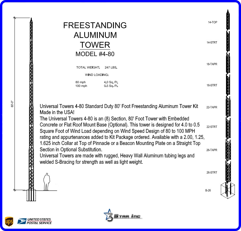 The Universal Towers 4-80 is an (8) Section, 80' Foot Tower with Optional Embedded Concrete Anchor Base or Flat Roof Mount. This Tower is designed for 4.0 to 0.5 Square Foot of Wind Load depending on Wind Speed Design of 80 to 100 MPH rating and appurtenances added to Kit Package ordered. Select from a 1.25, 1.625 or 2.00 inch Mast Collar at Top Cap Section Pinnacle or Optional Thrust Bearing Mounting Plate.