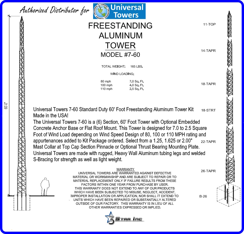 The Universal Towers 7-60 is a (6) Section, 60' Foot Tower with Optional Embedded Concrete Anchor Base or Flat Roof Mount. This Tower is designed for 7.0 to 2.5 Square Foot of Wind Load depending on Wind Speed Design of 80, 100 or 110 MPH rating and appurtenances added to Kit Package ordered. Select from a 1.25, 1.625 or 2.00 inch Mast Collar at Top Cap Section Pinnacle or Optional Thrust Bearing Mounting Plate.