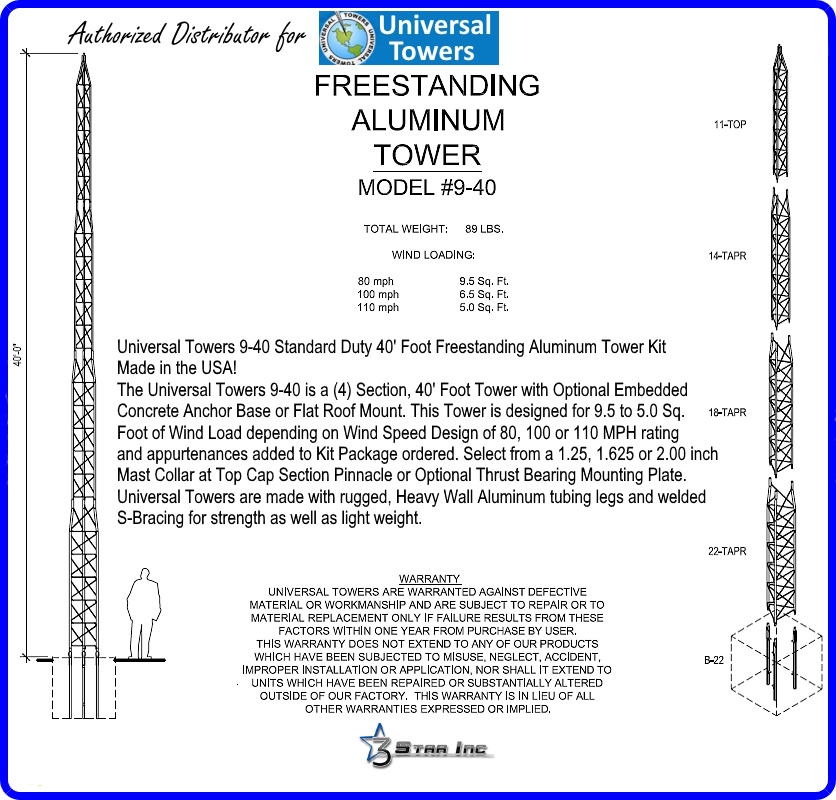 The Universal Towers 9-40 is a (4) Section, 40' Foot Tower with Optional Embedded Concrete Anchor Base or Flat Roof Mount. This Tower is designed for 9.5 to 5.0 Square Foot of Wind Load depending on Wind Speed Design of 80, 100 or 110 MPH rating and appurtenances added to Kit Package ordered. Select from a 1.25, 1.625 or 2.00 inch Mast Collar at Top Cap Section Pinnacle or Optional Thrust Bearing Mounting Plate.