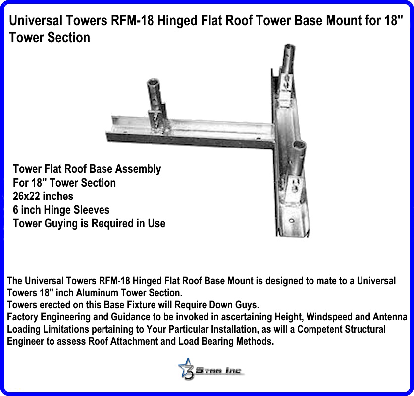 The Universal Towers RFM-18 Hinged Flat Roof Base Mount is designed to mate to a Universal Towers 18" inch Aluminum Tower Section.