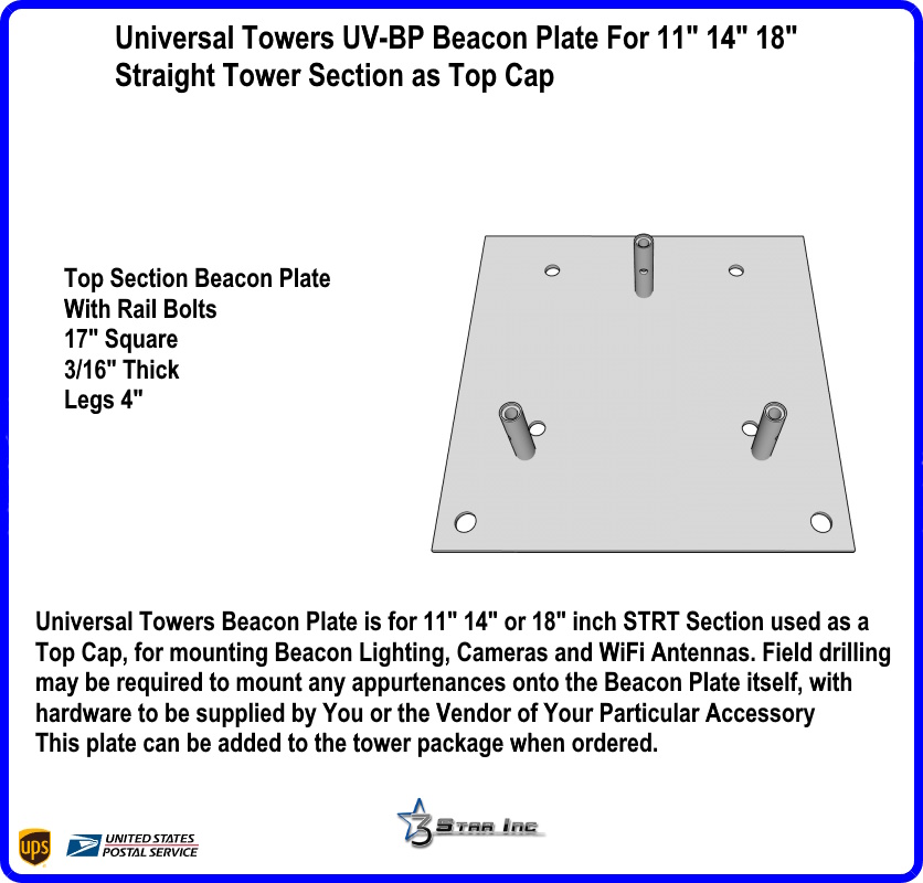 Universal Towers Beacon Plate is for 11" 14" or 18" inch STRT Section used as a Top Cap, for mounting Beacon Lighting, Cameras and WiFi Antennas. Field drilling may be required to mount any appurtenances onto the Beacon Plate itself, with hardware to be supplied by You or the Vendor of Your Particular Accessory