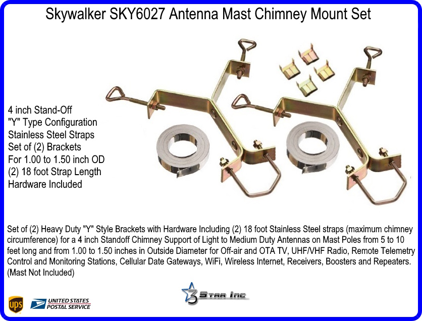 The Skywalker SKY6027 Antenna Mast Chimney Mount Set of (2) Heavy Duty "Y" Style Brackets with Hardware Including (2) 18 foot Stainless Steel straps (maximum chimney circumference) for a 4 inch Standoff Chimney Support of Light to Medium Duty Antennas on Mast Poles from 5 to 10 feet long and from 1.00 to 1.50 inches in Outside Diameter for Off-air and OTA TV, UHF/VHF Radio, Remote Telemetry Control and Monitoring Stations, Cellular Date Gateways, WiFi, Wireless Internet, Receivers, Boosters and Repeaters.(Mast Not Included)